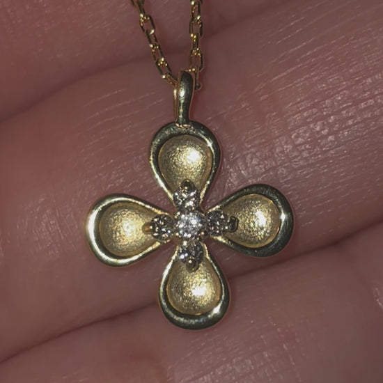 A solid four-petal design crafted in gold vermeil, set with a cluster of round brilliant-cut diamonds at its centre. Unlike the open styles in the collection, this piece has a softly brushed finish that gives it greater presence and weight while remaining refined on the neckline. Made in sterling silver with a 18k gold finish, the Fortune necklace measures 12mm and is intended as a special piece to be worn and stored with care to preserve its finish and brilliance.