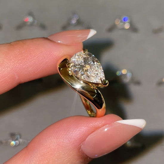 A striking expression of modern elegance, this sculptural design centres on a 2.00ct pear-cut diamond of exceptional quality, graded D colour and VVS2 clarity. Set in rich 18k yellow gold, the pear silhouette is both luminous and commanding, drawing the eye with its crisp brilliance and graceful taper.