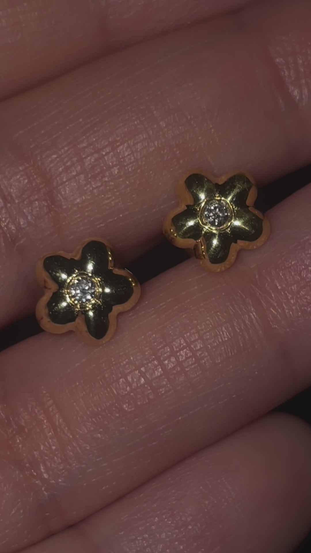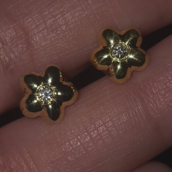 These delicate studs are shaped like a classic five-petal flower, with a small round diamond at the centre for subtle sparkle. Crafted in sterling silver with a thick gold vermeil finish, they are hypoallergenic and designed to sit lightly and elegantly on the ear. Measuring 7.5mm, these petite studs are perfect for layering or wearing alone, and should be handled with care to preserve their refined finish and shine.